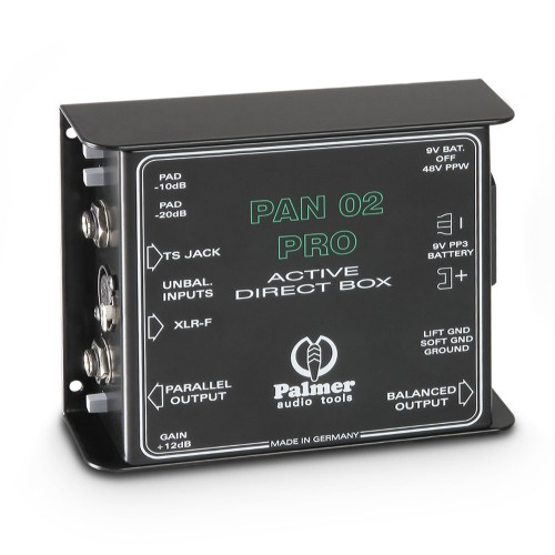 The Palmer PAN02 PRO is an active DI box with outstanding additional functions. These include an unbalanced XLR input, in addition to the 3-way attenuator -10, -20, -30 dB and a switchable gain of 12 dB, connected with a maximum output voltage of +20 dBu. The ground lift switch has a "lift" position allowing adjustments between a "soft and hard grounding" . The balanced output is achieved with a high quality transformer in the Mumetall housingthat was specially developed for this purpose. The PAN02 PRO can be powered either with a 9 V battery or 48 V phantom power. A two-colour LED indicates which source supplies the power.