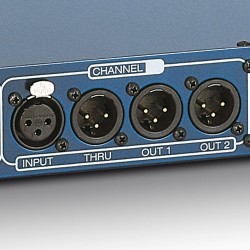 Passive splitter box for microphone signals. One module has 4 channels. Each channel has an input, an output wired in parallel for passthrough of phantom power, and two splitter transformer-isolated outputs. All outputs are also decoupled via resistors.