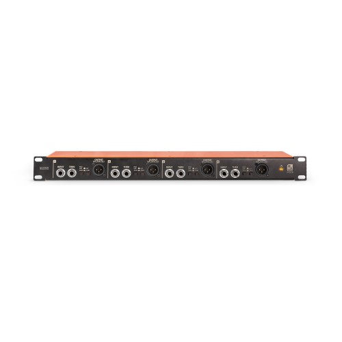 Each channel is equipped with a 6.3 mm jack input, a THRU-Out (for forwarding the input signals to an amplifier, for example), and two transformer-balanced XLR outputs - one at the front and one at the rear.