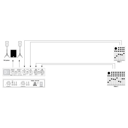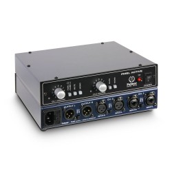 The PMBL-ACTIVE is a 2-channel stereo line level merge box that can be used to merge two stereo line signals into one stereo output. One classic application: routing two mixing desks to one PA system. The unit has enough amplification to boost even semi-professional levels accordingly. The input channels are galvanically isolated from one another. Each channel offers a mute switch and the ability to mix the stereo signal down to mono. The unit is housed in a 1 U/9.5" case and has a built-in power supply.
