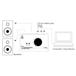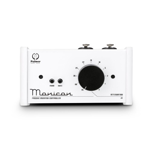 With Palmer Monicon®, your monitor volume is always under control. The passive mini-mixer with the oversized control is inserted between the stereo output of the notebook, PC or interface and an active monitor system and thus permits convenient and precise volume control of the monitors from the workstation. The passive circuitry with only a few components has absolutely no affect on the sound. Mute and mono buttons make it possible to mute the outputs and merge the stereo output signal into a mono master signal.