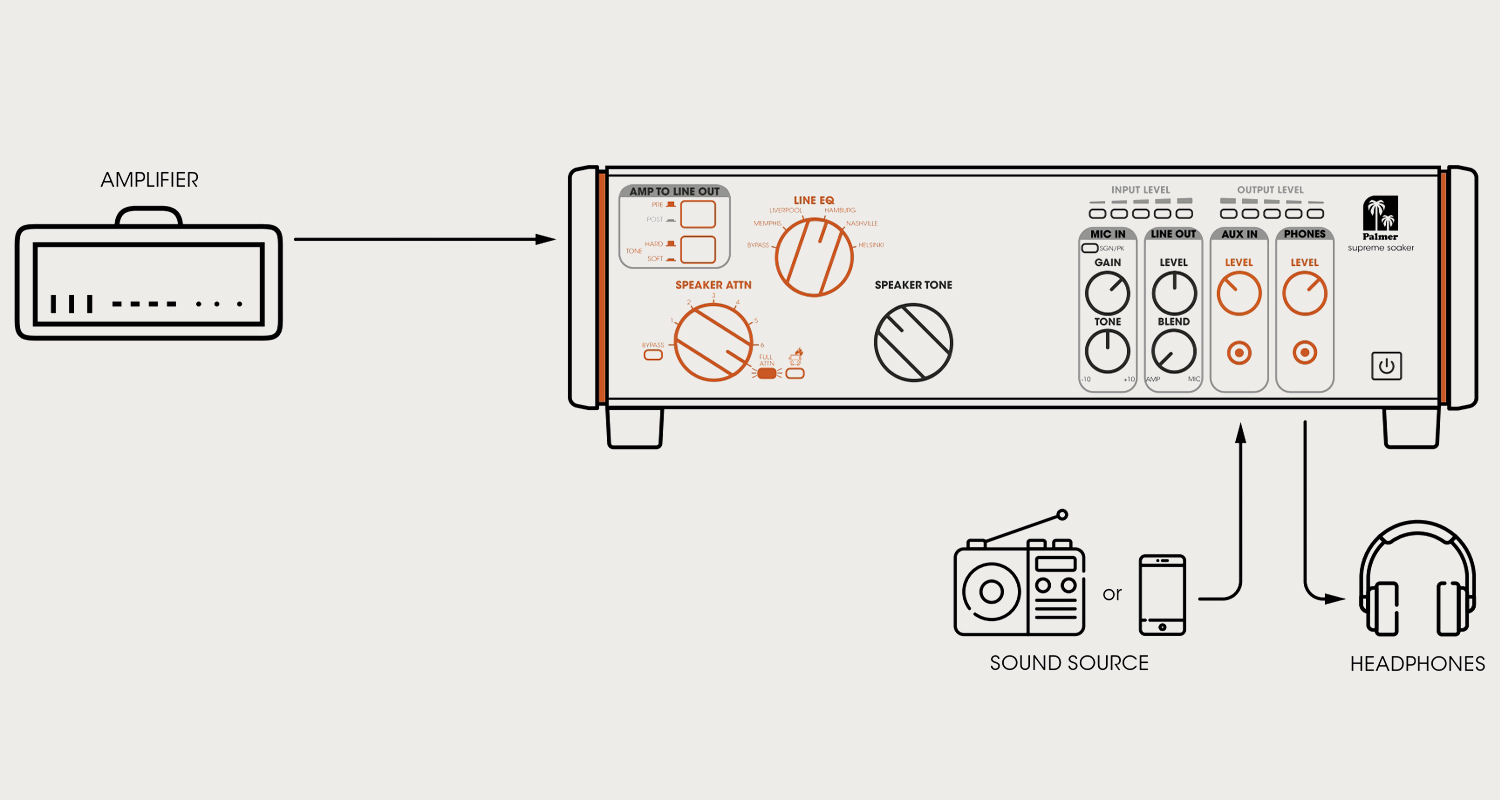The Supreme Soaker has your back whether you’re playing a show or practicing at home. At gigs, use the Mic/Line In to blend your favourite cab/mic combo with the Supreme Soaker’s speaker simulator for a supreme analog sound experience. When you need to be quiet, the Headphone Out is your friend. And if you want to jam along to backing tracks, or even play to a click, the Aux Input makes this an exercise in convenience.