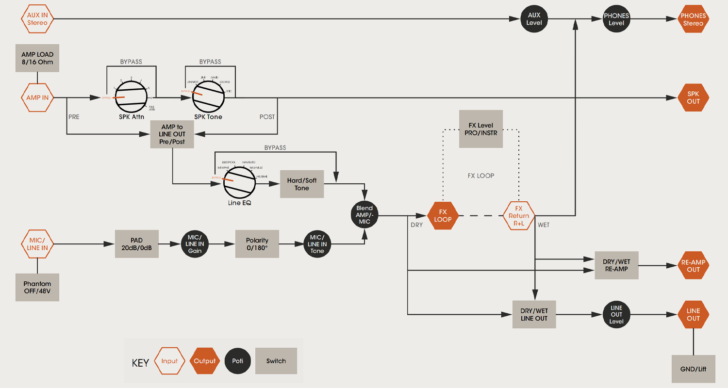 - Microphone / line input (blendable with speaker simulator)